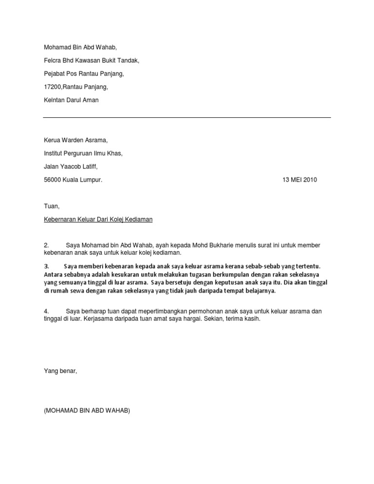 Contoh Surat Rasmi Memohon Kebenaran Keluar Asrama Contoh Surat