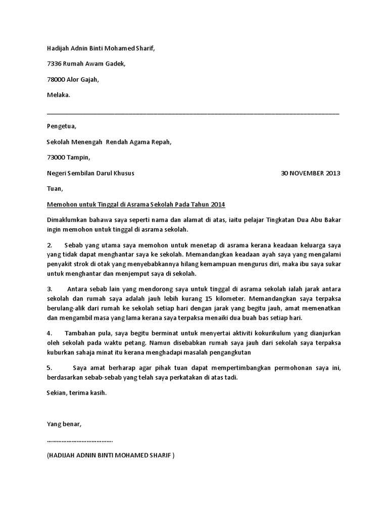Surat Permohonan Asrama Hadijah Pdf